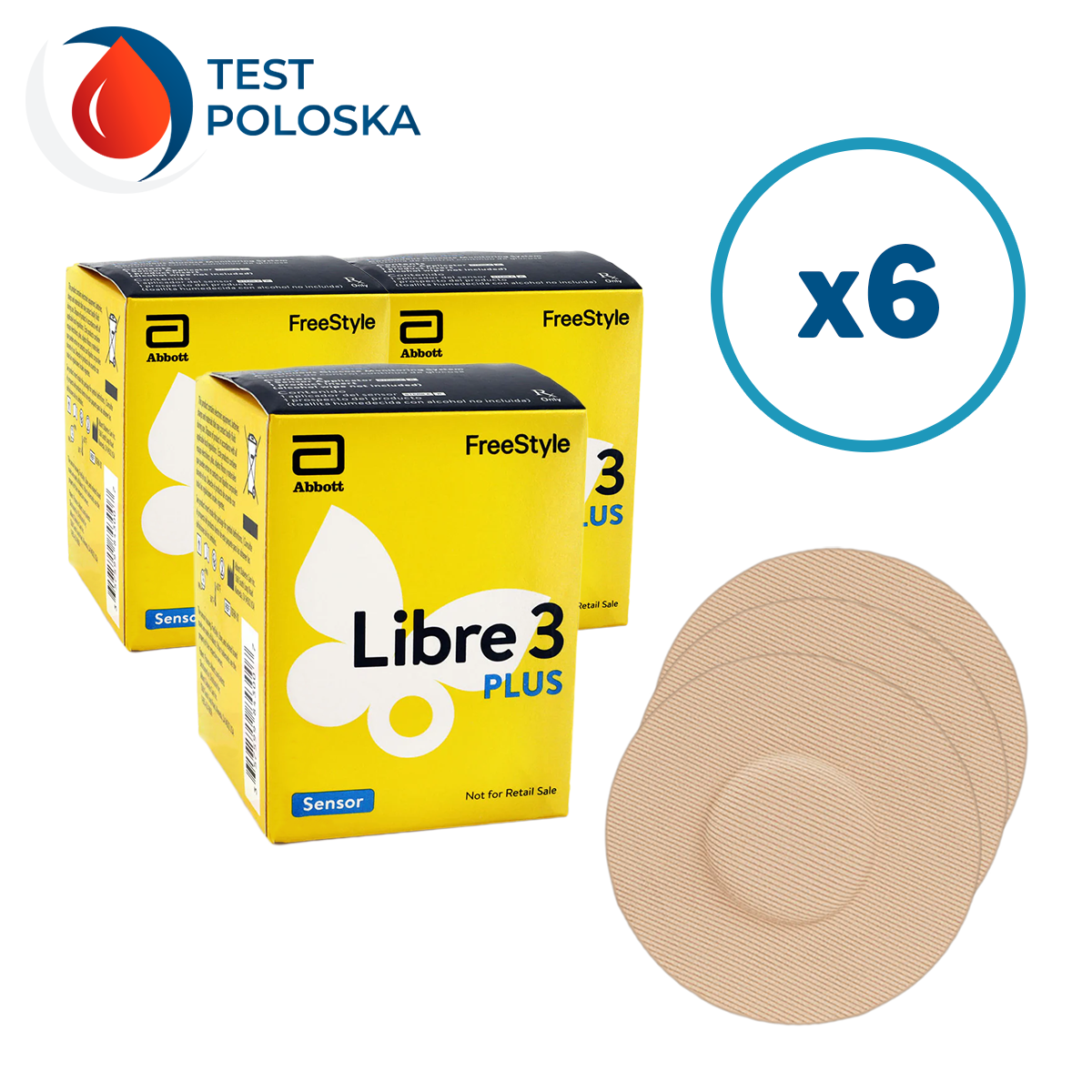 Цей комплект містить 6 сенсорів Freestyle Libre 3 Plus і шість тейпів для зручності використання.