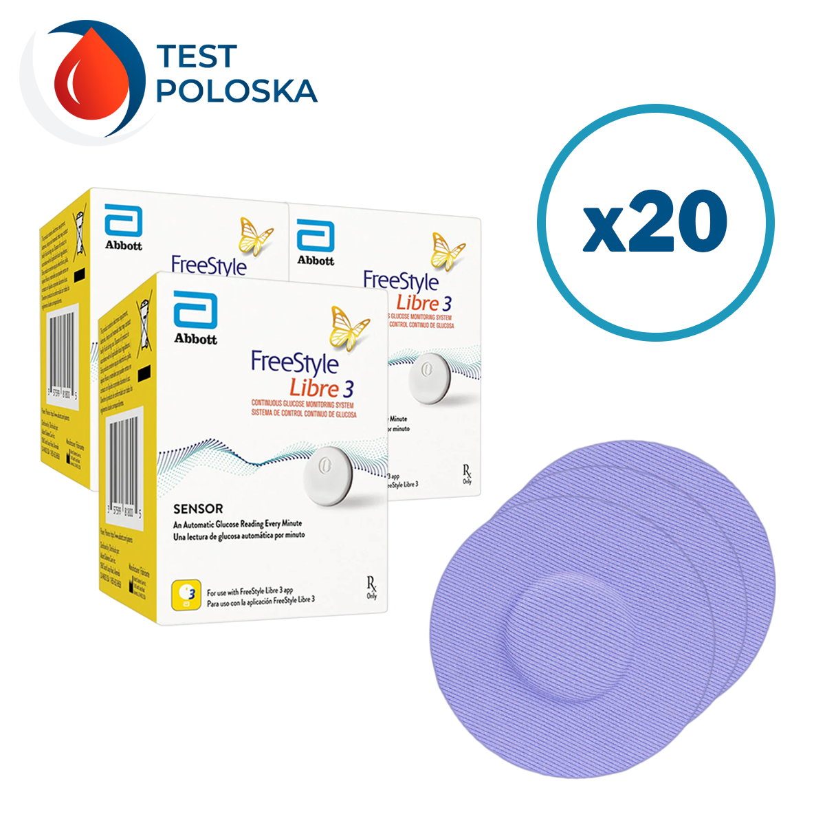 Этот комплект включает в себя 20 сенсоров Freestyle Libre 3 и двадцать цветных тейпов для удобства использования.